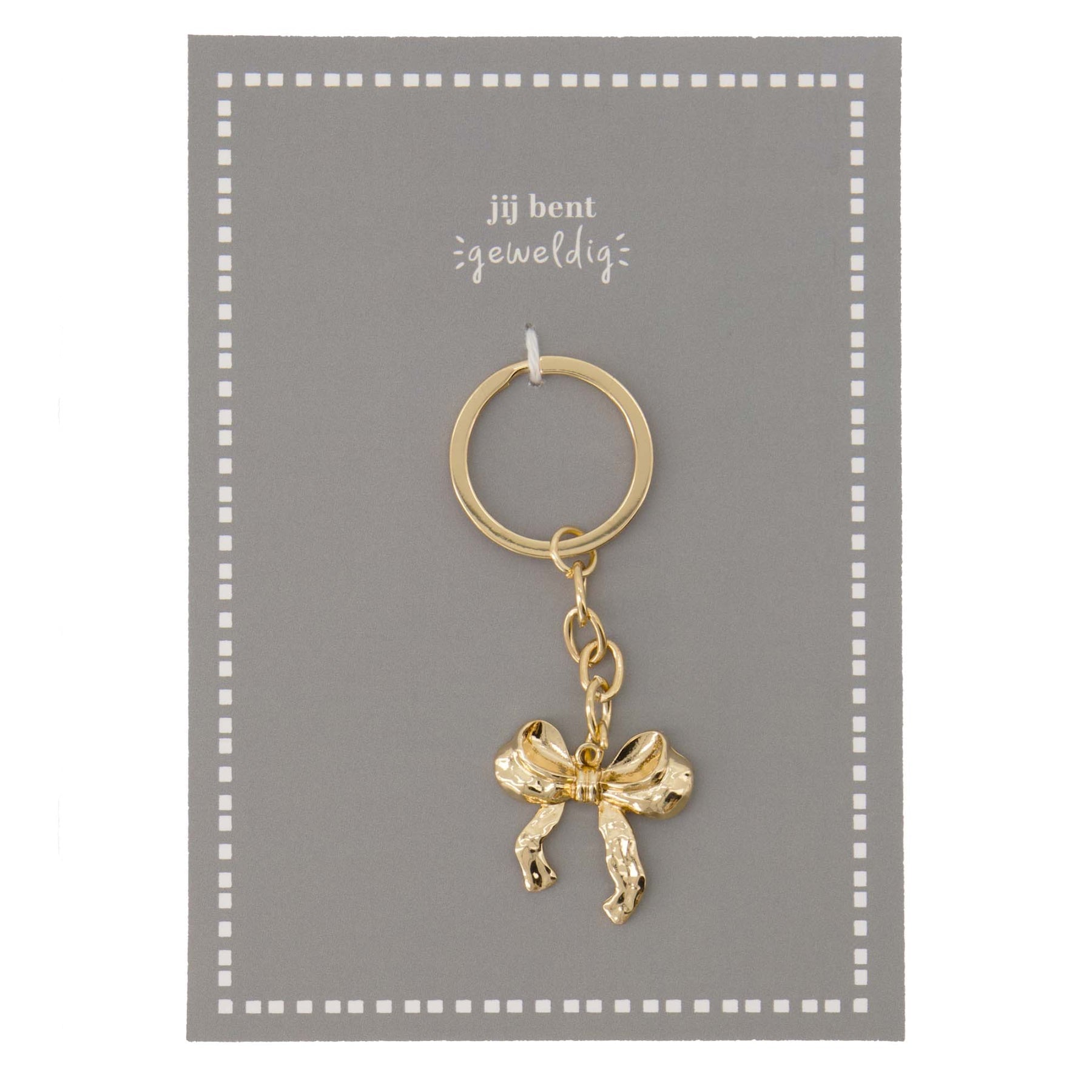 Je bevestigt deze elegante gouden sleutelhanger aan je sleutelbos of tas en voelt direct een glimlach opkomen. Het goudkleurige materiaal met de subtiele strik geeft een luxe en stijlvol gevoel. Elke keer dat je je sleutels pakt of je tas opent, zie je dit kleine elegante detail dat je dag net even mooier maakt. De bijbehorende ansichtkaart maakt het geven van deze sleutelhanger extra persoonlijk – schrijf een lieve boodschap en maak iemand blij! Of het nu voor jezelf is of als attent cadeautje voor een vriendin, collega of familielid – deze sleutelhanger past bij elke stijl. De stevige ring zorgt ervoor dat hij veilig blijft zitten, waar je ook naartoe gaat.