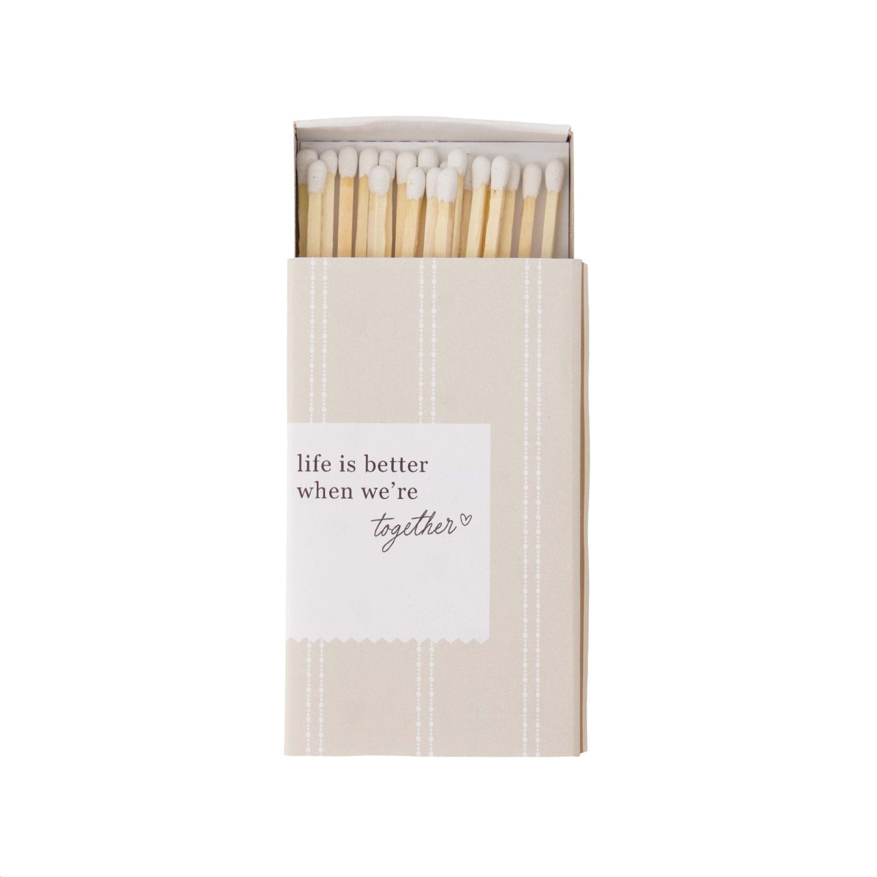 Je steekt je favoriete geurkaars aan met deze mooie lucifers en de warme boodschap 'Life is better when we're together' herinnert je eraan om te genieten van de momenten met je dierbaren. Het stijlvolle luciferdoosje staat decoratief naast je kaarsen en voegt net dat beetje extra toe aan je interieur. Of je nu een gezellige avond thuis creëert of een romantisch diner voorbereidt – deze lucifers maken het moment compleet.