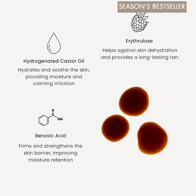 Aqua, Dihydroxyacetone, Alcohol Denat., Erythrulose, Dimethyl Isosorbide, Vitex Agnus Castus Extract, Caramel, Glycerin, Parfum, Acetyl Tyrosine, PEG-40 Hydrogenated Castor Oil, Benzoic Acid, CI 16035, Trideceth-9, Propylene Glycol, Xanthan Gum, Alpha-Isomethyl Ionone, Dehydroacetic Acid, Citronellol, Coumarin, Geraniol, Linalool, Phenoxyethanol.