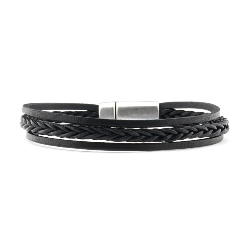 Een armband met een mooie leren vlecht, gecombineerd met 2 leer stroken. De armband is voorzien van een zilverkleurige, hoogwaardige, nikkelvrije magneetsluiting.