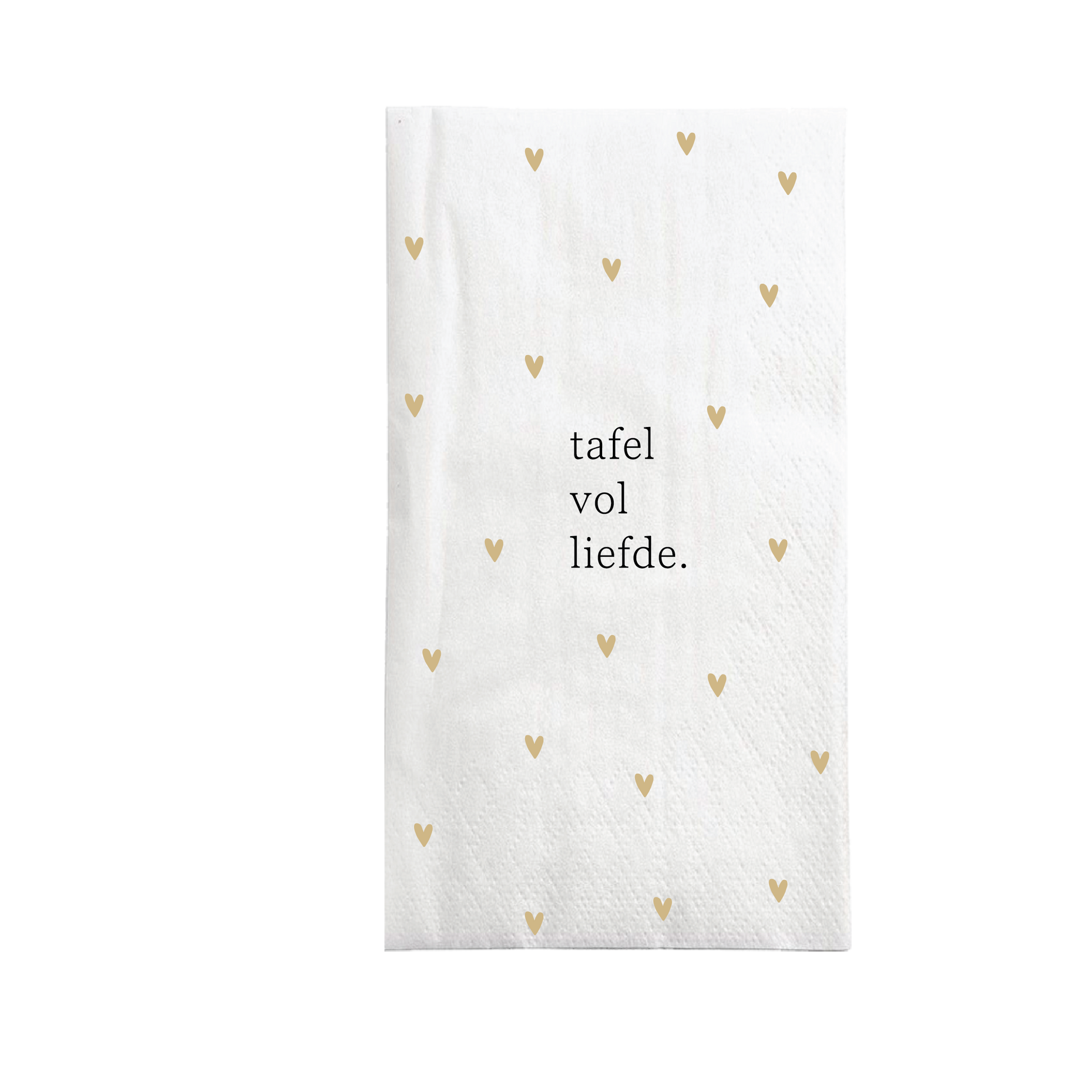 Je dekt de tafel voor een gezellig diner met vrienden of familie. Deze mooie servetten met hartjes en de boodschap 'tafel vol liefde' geven je tafel direct een warme, persoonlijke uitstraling. De vrolijke okergele hartjes passen perfect bij verschillende serviesstijlen en creëren een liefdevolle sfeer. Of je nu een rustig ontbijt serveert, een high tea organiseert of een feestelijk diner voorbereidt – deze servetten maken elk moment specialer en herinneren je eraan om je tafel vol liefde te dekken.