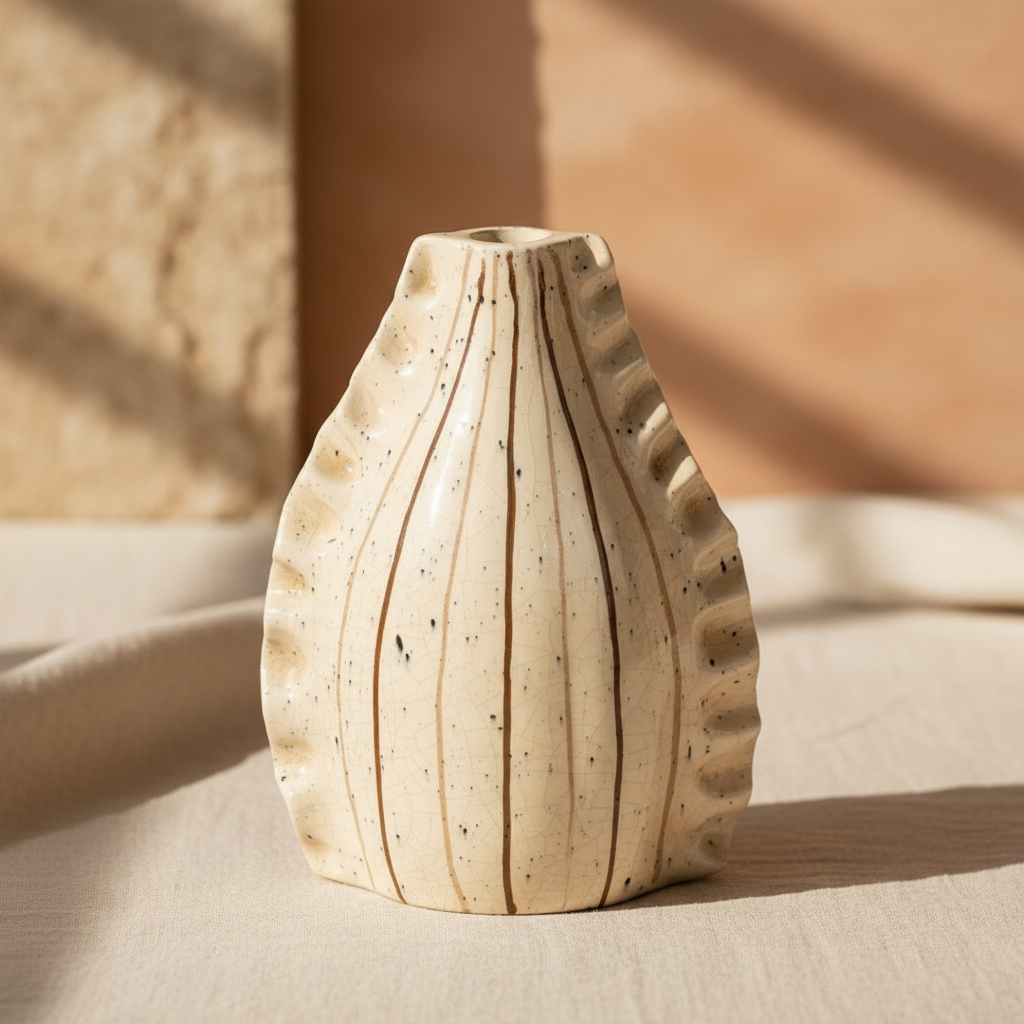 Deze elegante aardewerk vaas trekt meteen de aandacht met haar bijzondere vorm en verfijnde details. De zachte crème kleur met subtiele bruine strepen en speelse ribbels aan de zijkanten zorgt voor een natuurlijke, moderne uitstraling.