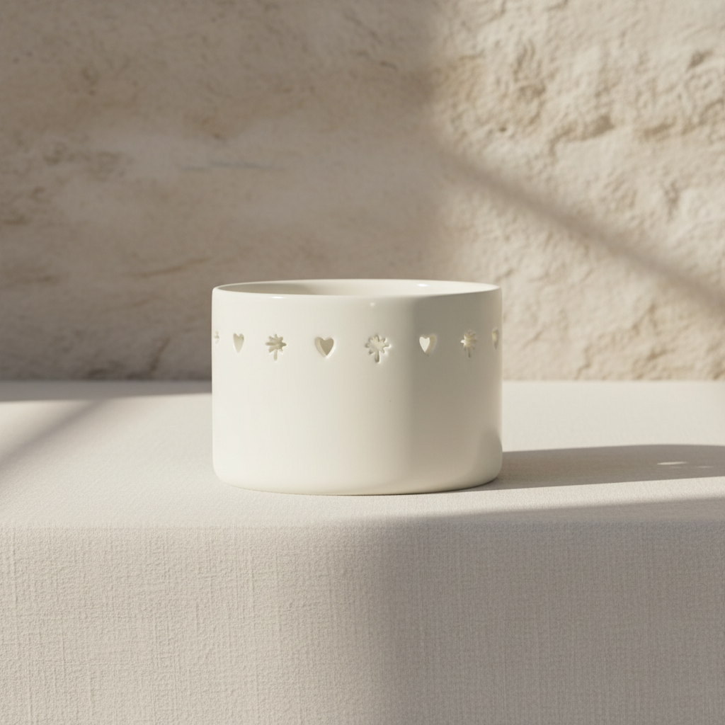 Deze Zusss keramiek waxinelichthouder brengt warmte in huis met een subtiel hart- en sterpatroon. De waxinelichthouder is uitgevoerd in wit keramiek, wat zorgt voor een rustige, lichte uitstraling. Perfect om kaarslicht zacht te laten schijnen en een gezellige sfeer te creëren in jouw woonkamer of eetkamer. De eenvoudige, ronde vorm maakt het een tijdloze woonaccessoire die makkelijk te combineren is met jouw interieur. Voeg deze charmante waxinelichthouder toe voor dat fijne, warme lichtmomentje.