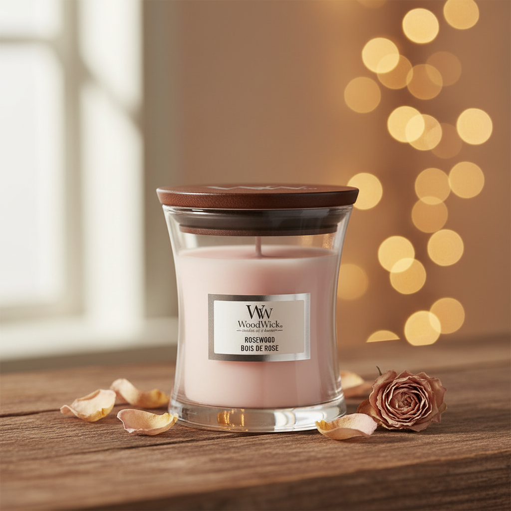 WoodWick Mini Candle Rosewood : Rosewood laat tinten van licht zoetig op een mooie manier samen komen met prettige zacht warme tinten met een houtige ondertoon, door deze fraaie combinatie kwam deze rustgevende geur tot stand.